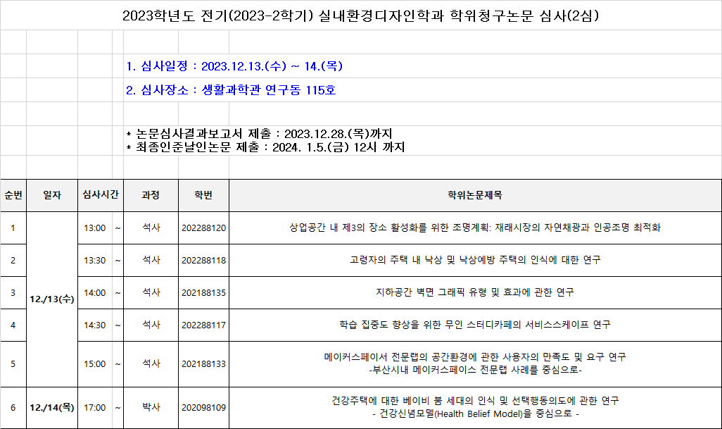 2023학년도 2학기 일반대학원 학위청구 논문심사 2심 세부일정을 다음과 같이 안내합니다.
