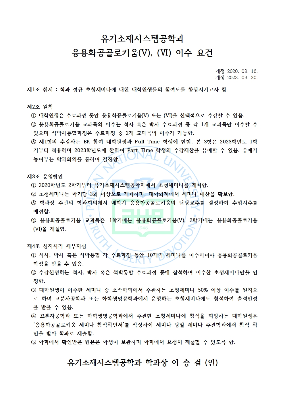 [규정] 유기소재시스템공학과 응용화공콜로키움(V), (Ⅵ) 이수 요건안내