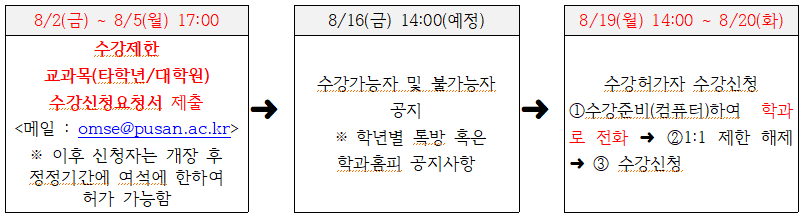 ④ 8/6(화) 이후에 수강제한교과목 수강요청사항은 수강정정기간(9/2(월) ~ 9/6(금))에 여석에 한하여 학과에서 대면 수강신청예정임. 추후 학과홈피 공지 참고.