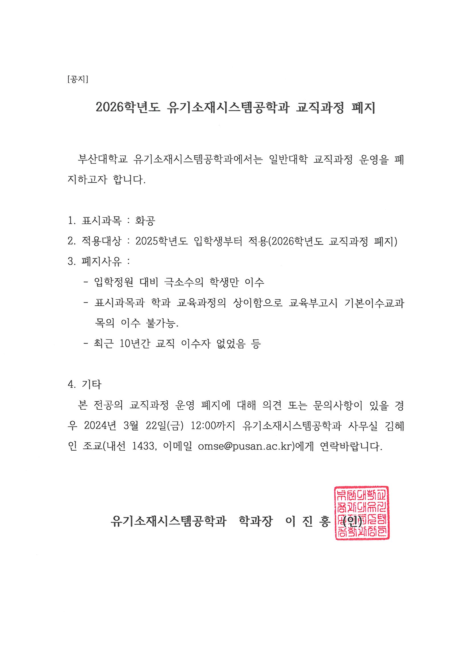 [교직] 유기소재시스템공학과 교직과정 폐지 안내